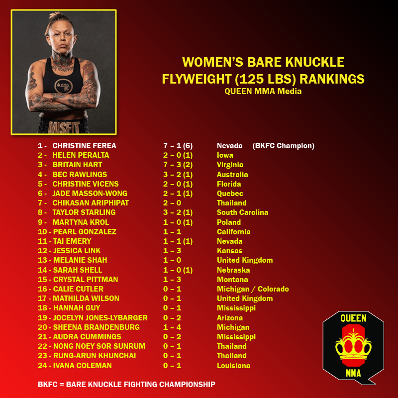 WOMEN’S BARE KNUCKLE BOXING FLYWEIGHT (125 LBS) RANKINGS Posted on May 28, 2023 by vmetromultimedia Leave a comment QUEEN MMA Media / Women’s Bare Knuckle Flyweight Rankings (As of May 28, 2023) Numbers within ( ) designate the number of wins via finish. Share this: Share on X (Opens in new window) X Share on Facebook (Opens in new window) Facebook Like Loading... Related Queen MMA